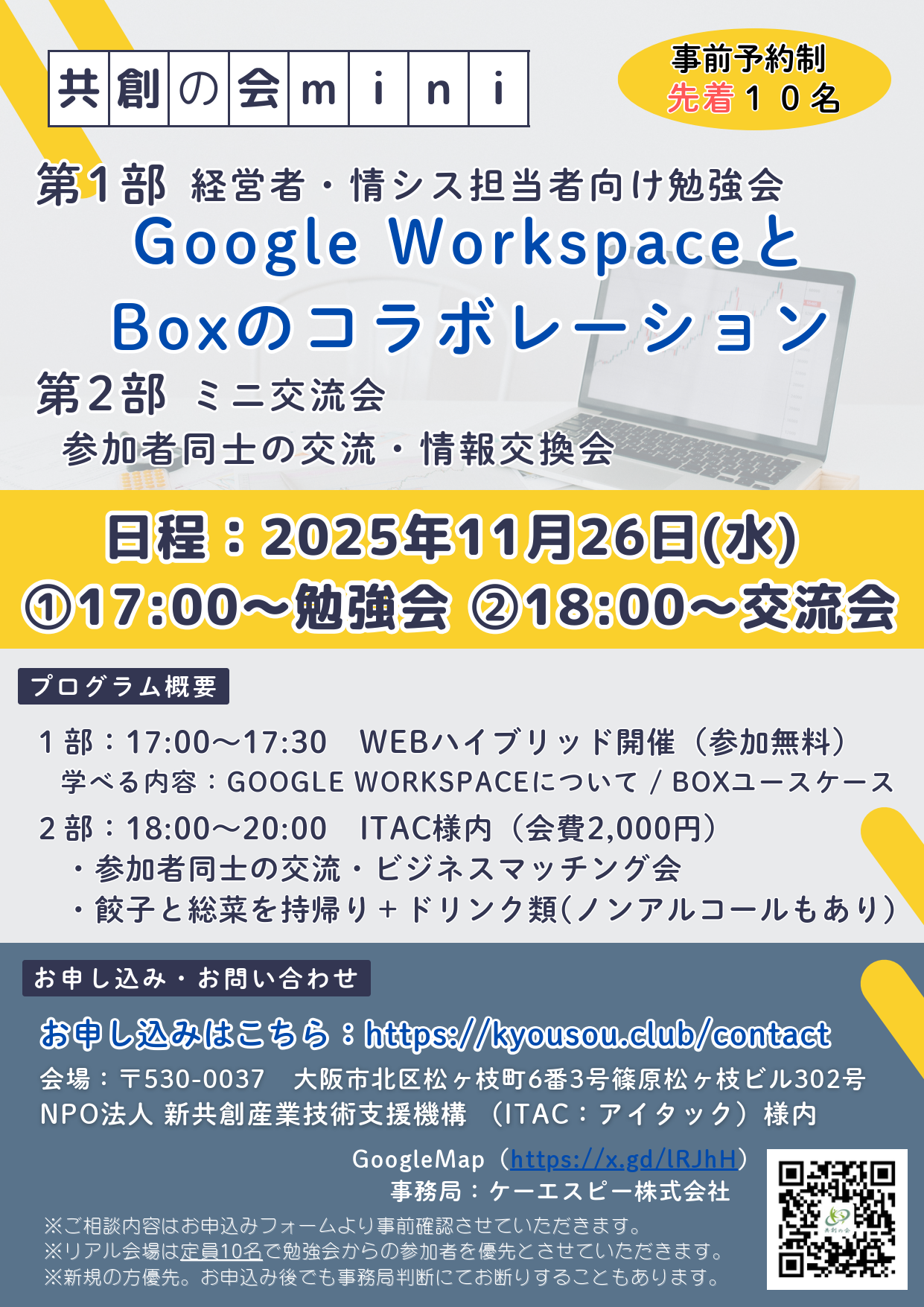 2025年11月20日 / 最終更新日時 : 2025年11月20日 Miyazaki@KSP&KyousouClub マッチングイベント 共創の会mini251126:GoogleWorkspaceと Boxのコラボレーション フォローする @kyousou_club 共創の会miniお申込みはこちらWEBフォームよりお申込みくださいFacebooktwitter
